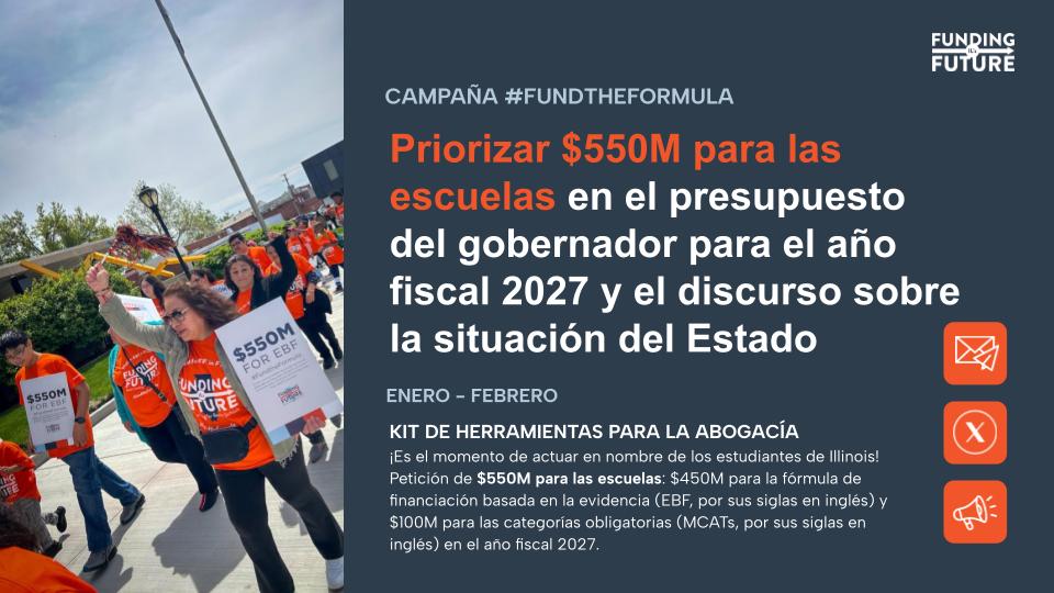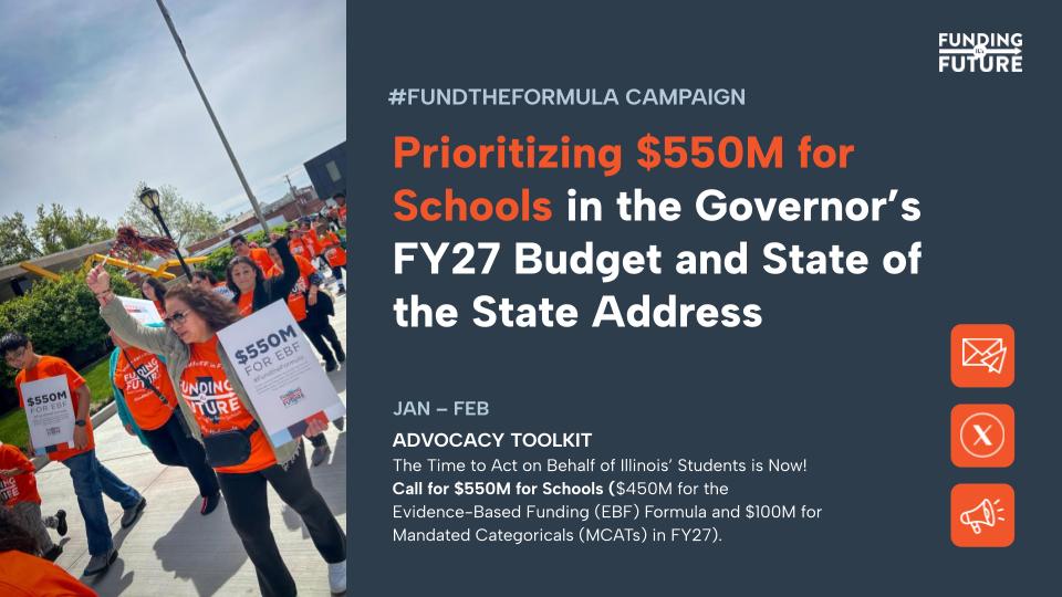 Este kit de herramientas de defensa explica por qué un aumento de $450 millones en el Financiamiento Basado en Evidencia (EBF, por sus siglas en inglés) y $100 millones para los Categóricos Obligatorios (MCATs) son fundamentales en este año fiscal. Incluye mensajes clave claros, textos listos para usar y acciones concretas de incidencia para ayudarle a involucrar a legisladores, personal de agencias y miembros de la comunidad, al mismo tiempo que se elevan las voces locales y se refuerza la urgencia de una inversión sostenida en la educación pública de Illinois.